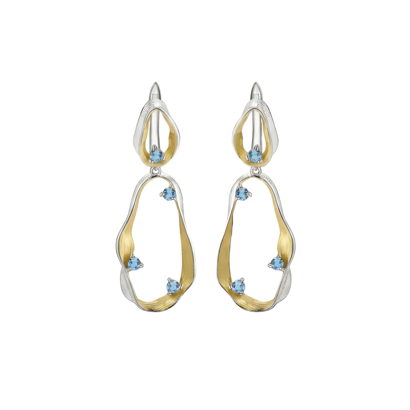 Sıcak altın dokunuşlar, serin gümüş çerçeveyle zarif bir kontrast oluşturarak hareketle birlikte değişen yumuşak bir ışıltı yaratır. Açık yapının içine serpiştirilmiş mavi kübik zirkonya taşlar ise, ışık damlaları gibi asılı duran narin bir parlaklık ekler.